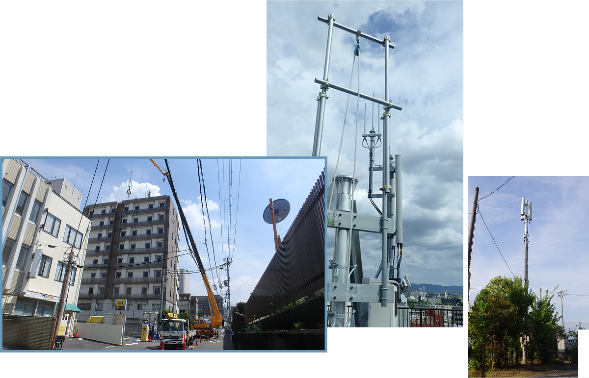 基地局やアンテナ設置、通信機器の配線・調整まで幅広く対応。5G・LTEなど最新通信環境の整備を通じ、安定した通信ネットワークの構築を支えています。