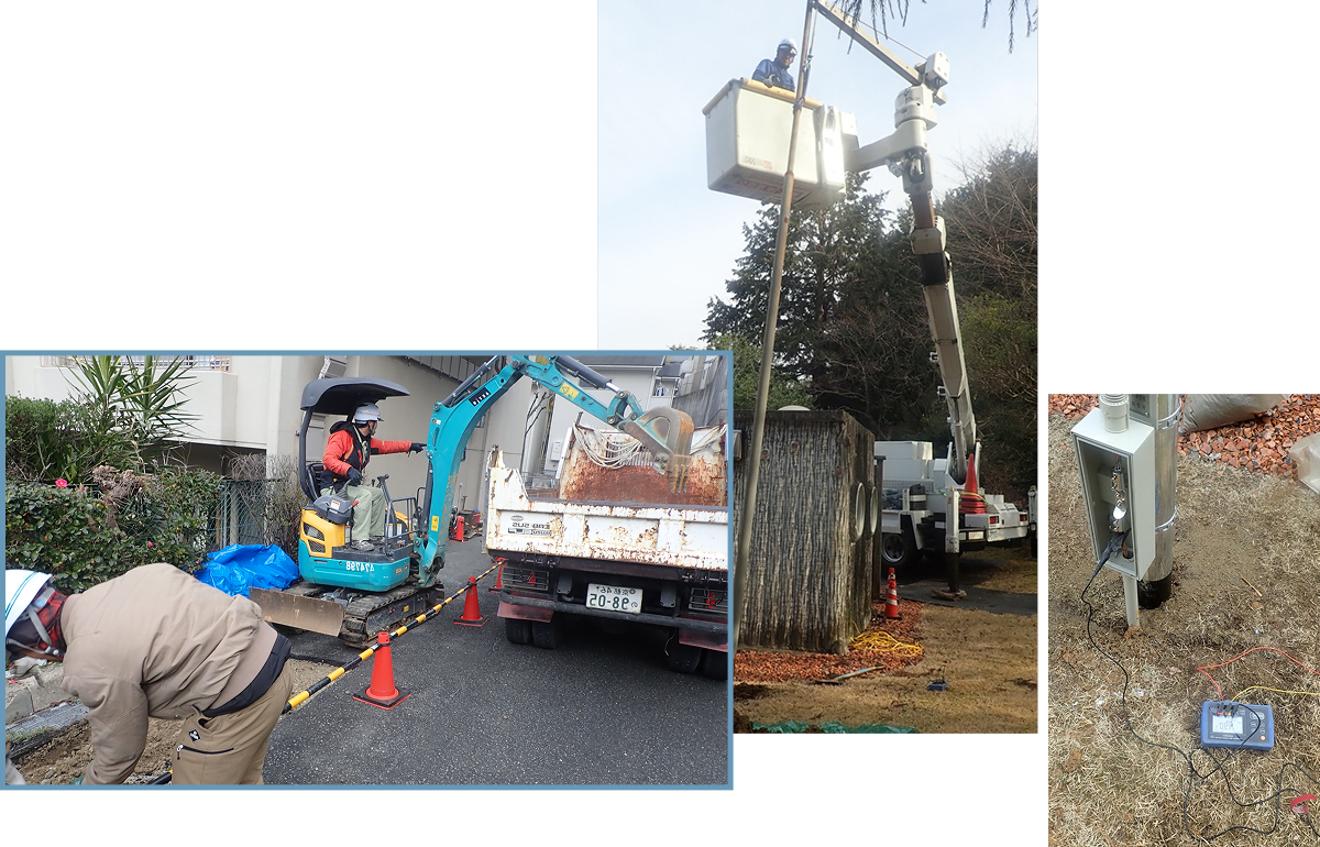電柱・地中埋設管・配電設備など、電気インフラの基盤を支える土木工事をトータル対応。安全基準に基づく高品質な施工で、社会インフラの安定稼働を支えます。